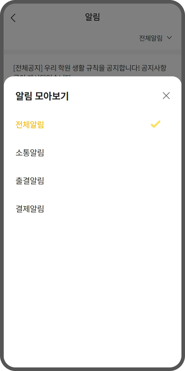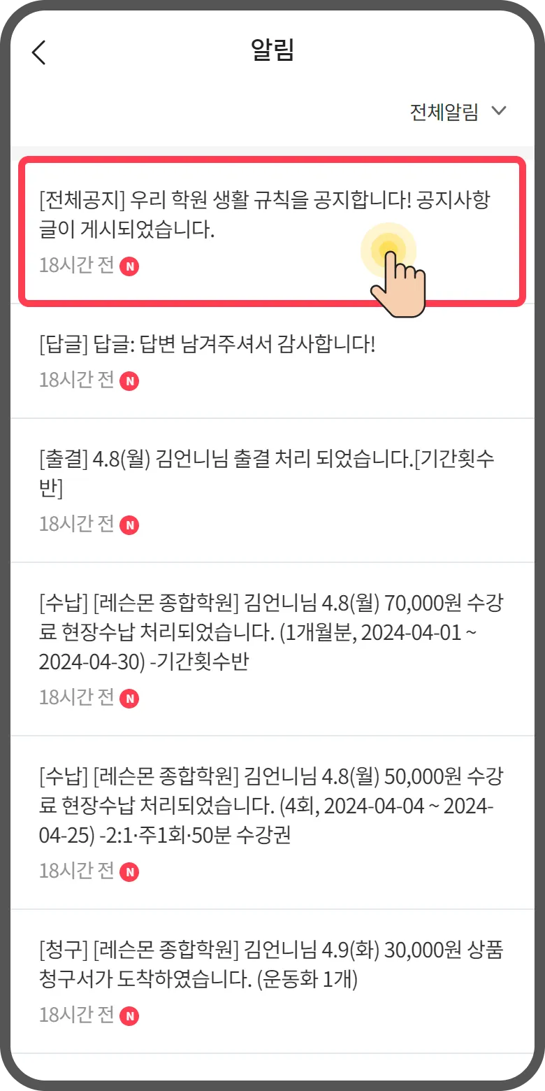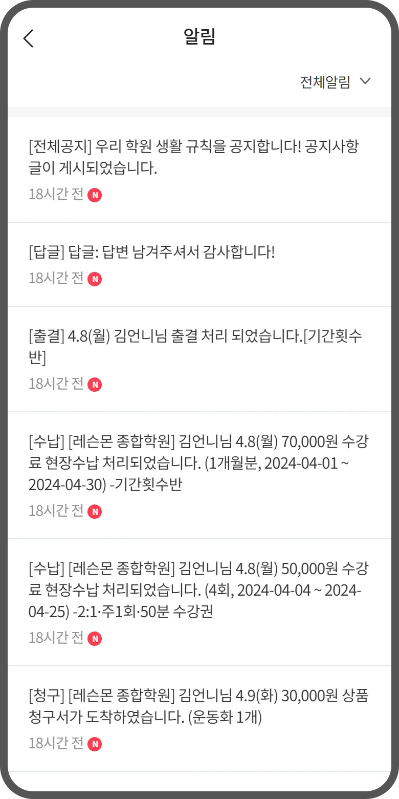 공지사항, 출결, 결제, 초대, 업무노트, 상담 등 학원에 중요한 알림을 확인 가능해요!