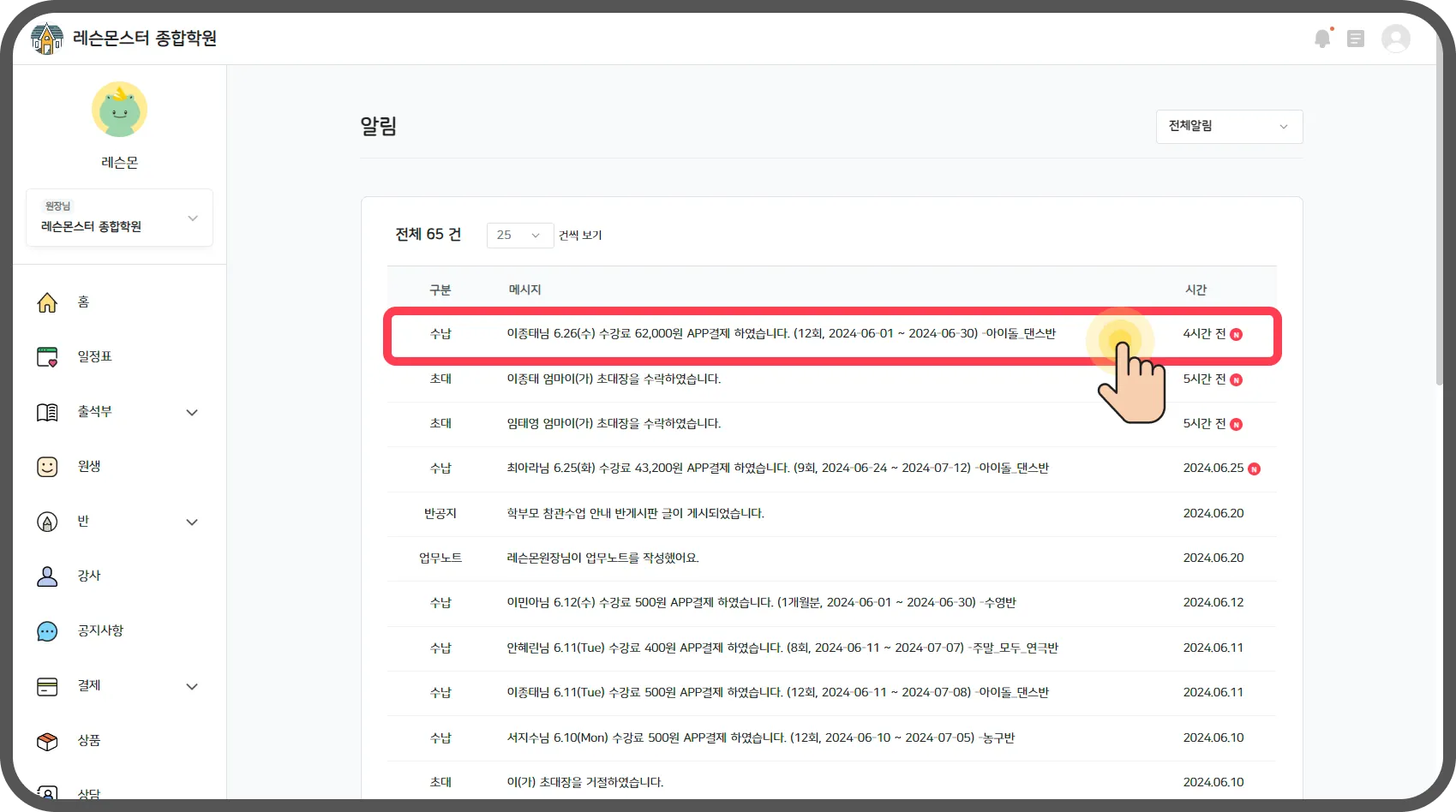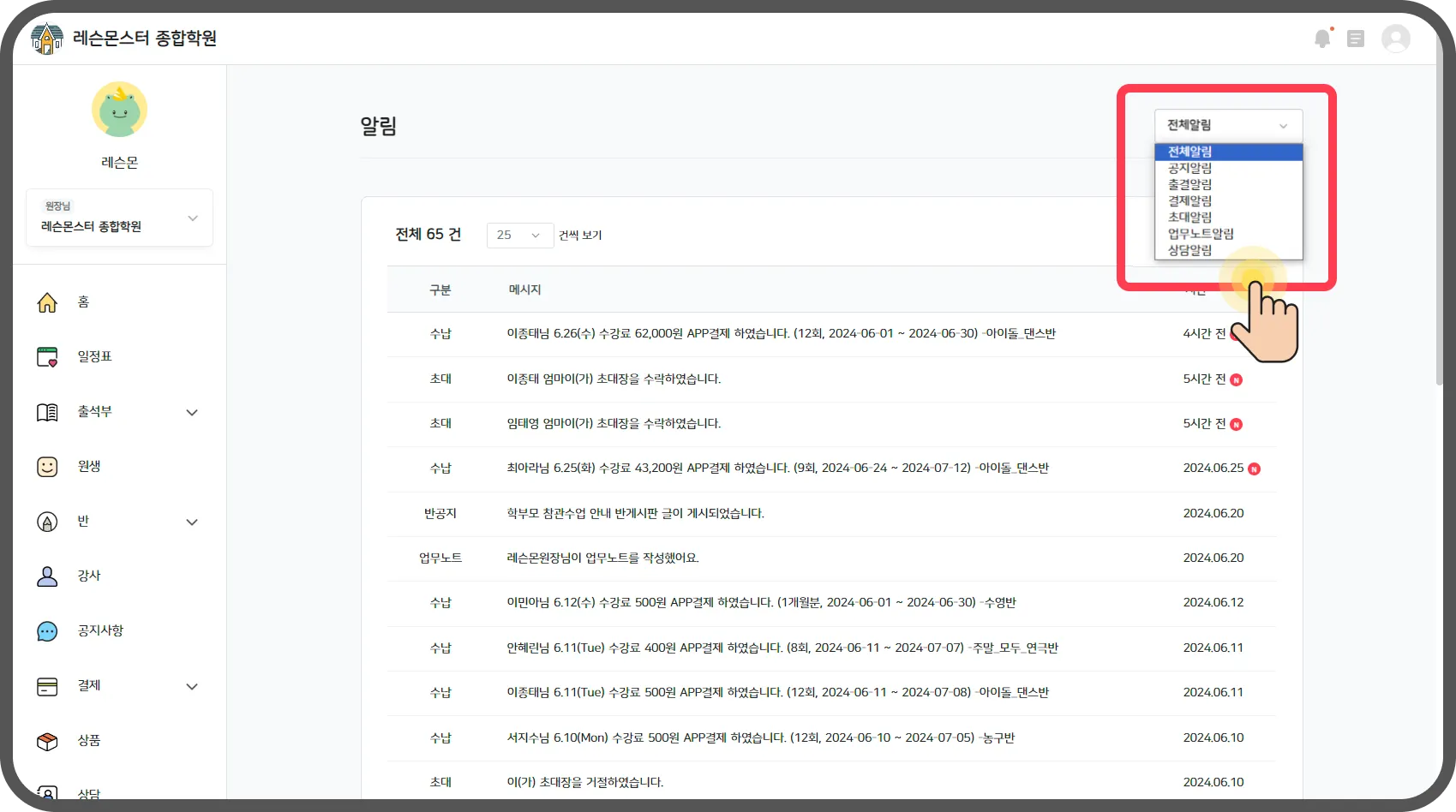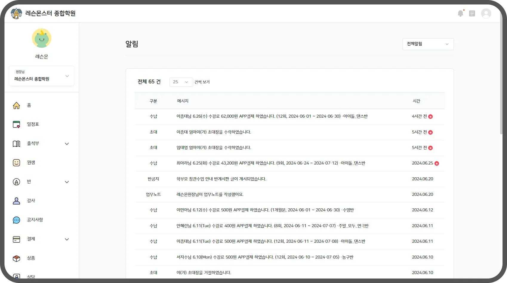 공지사항, 출결, 결제, 초대, 업무노트, 상담 등 학원 운영에 중요한 알림을