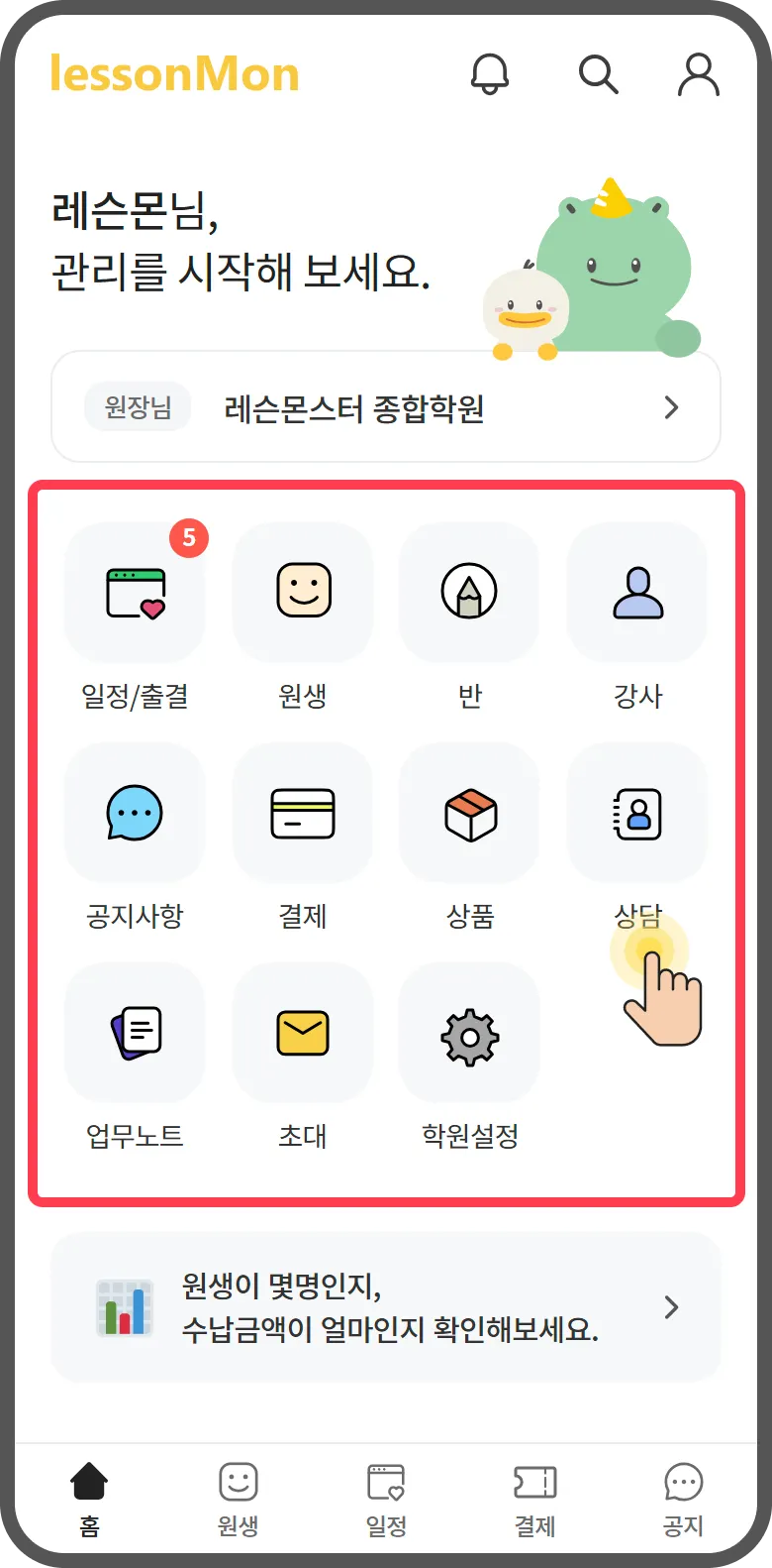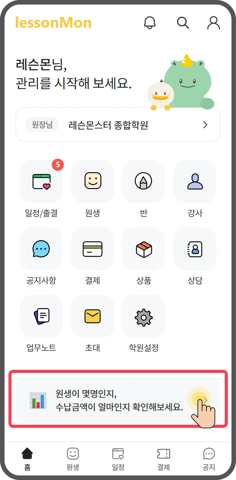 상단바에서는 알림과 내정보 및 원생 검색을 확인할 수 있습니다.