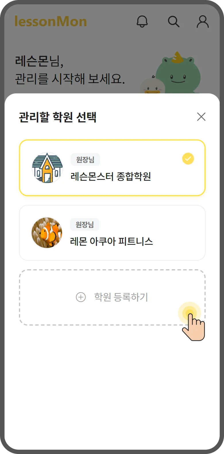 관리할 학원을 선택해 여러개의 학원에 입장 가능합니다.
