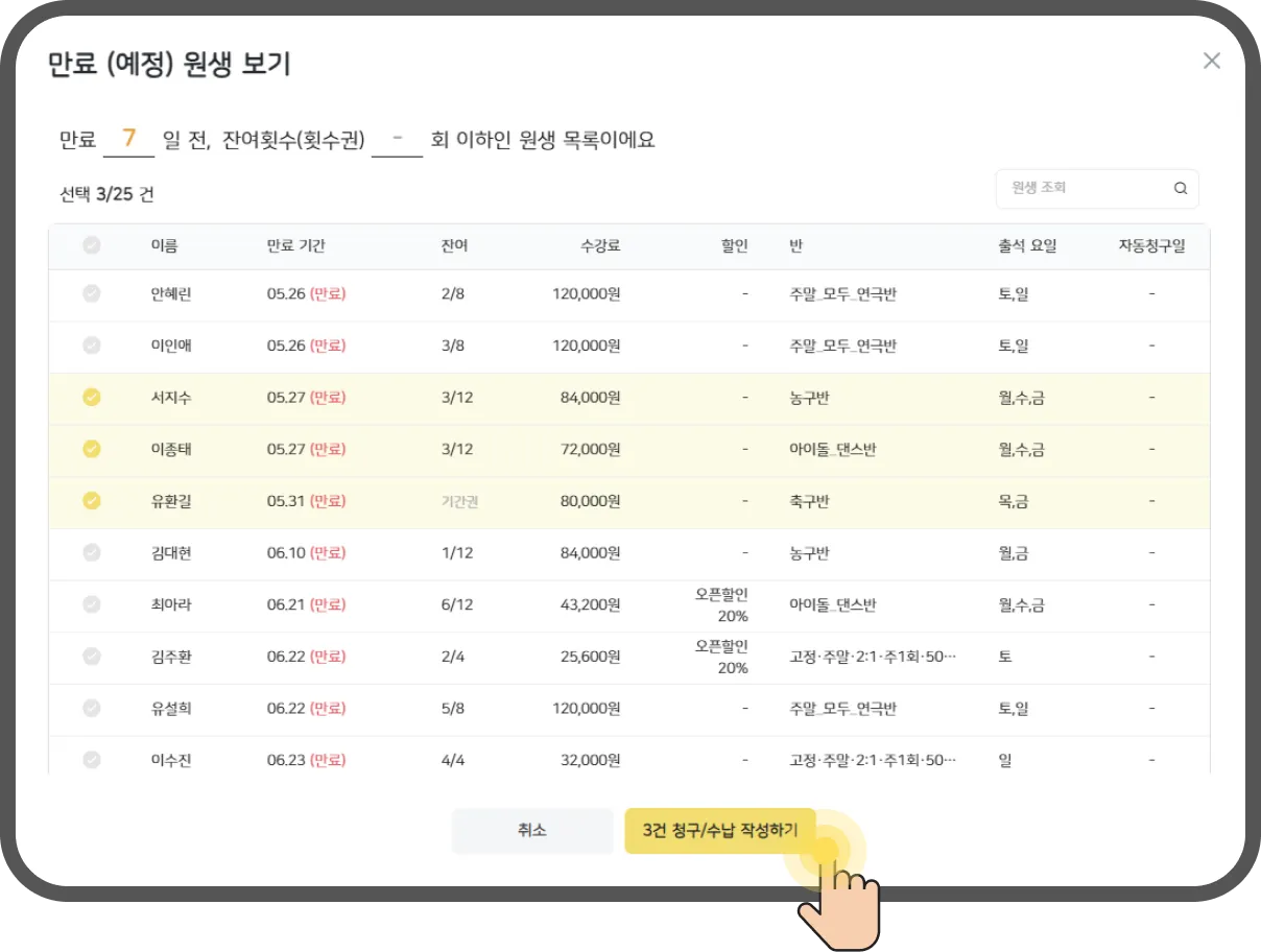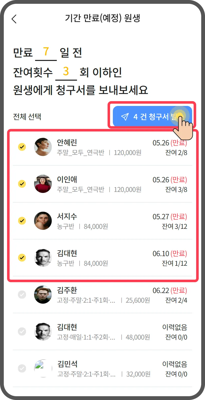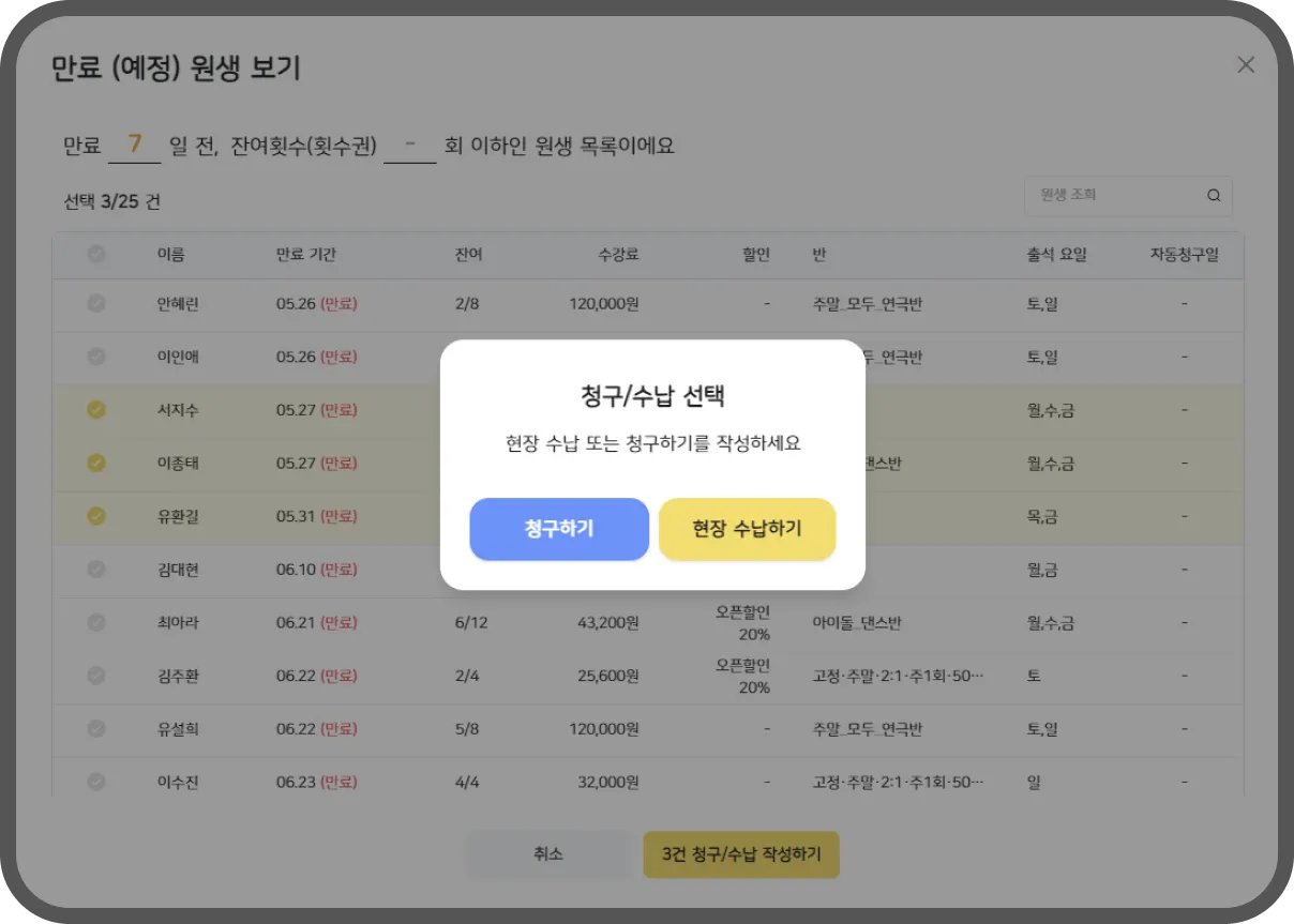 수강권이 만료되었거나 곧 만료되는 원생을 쉽게 조회 & 일괄 청구할 수 있습니다!