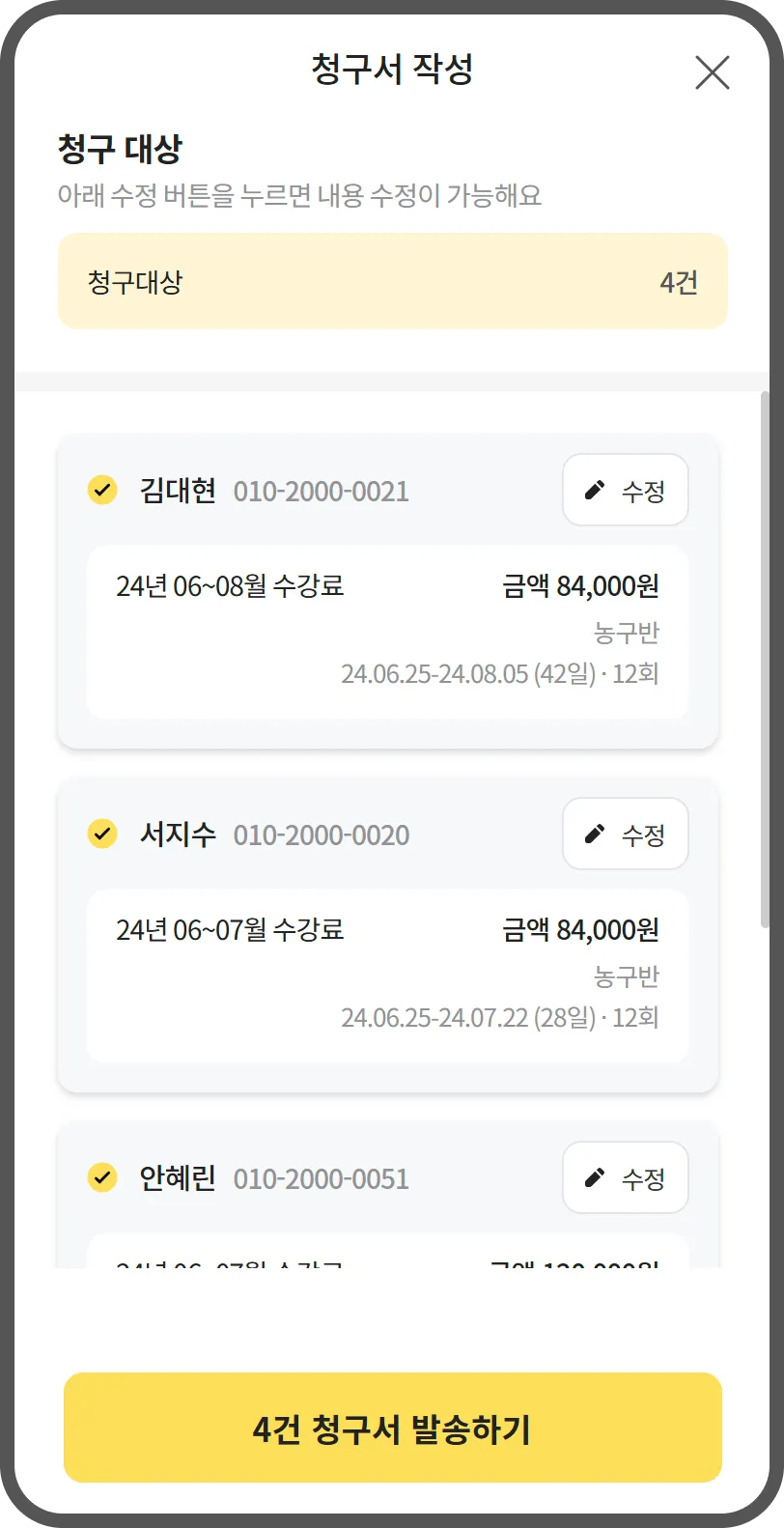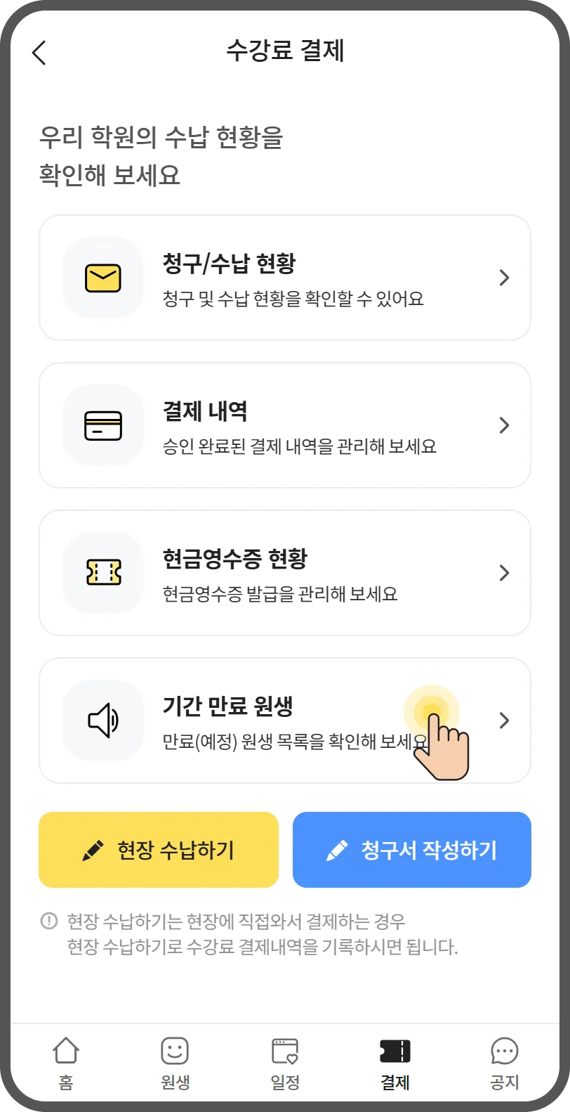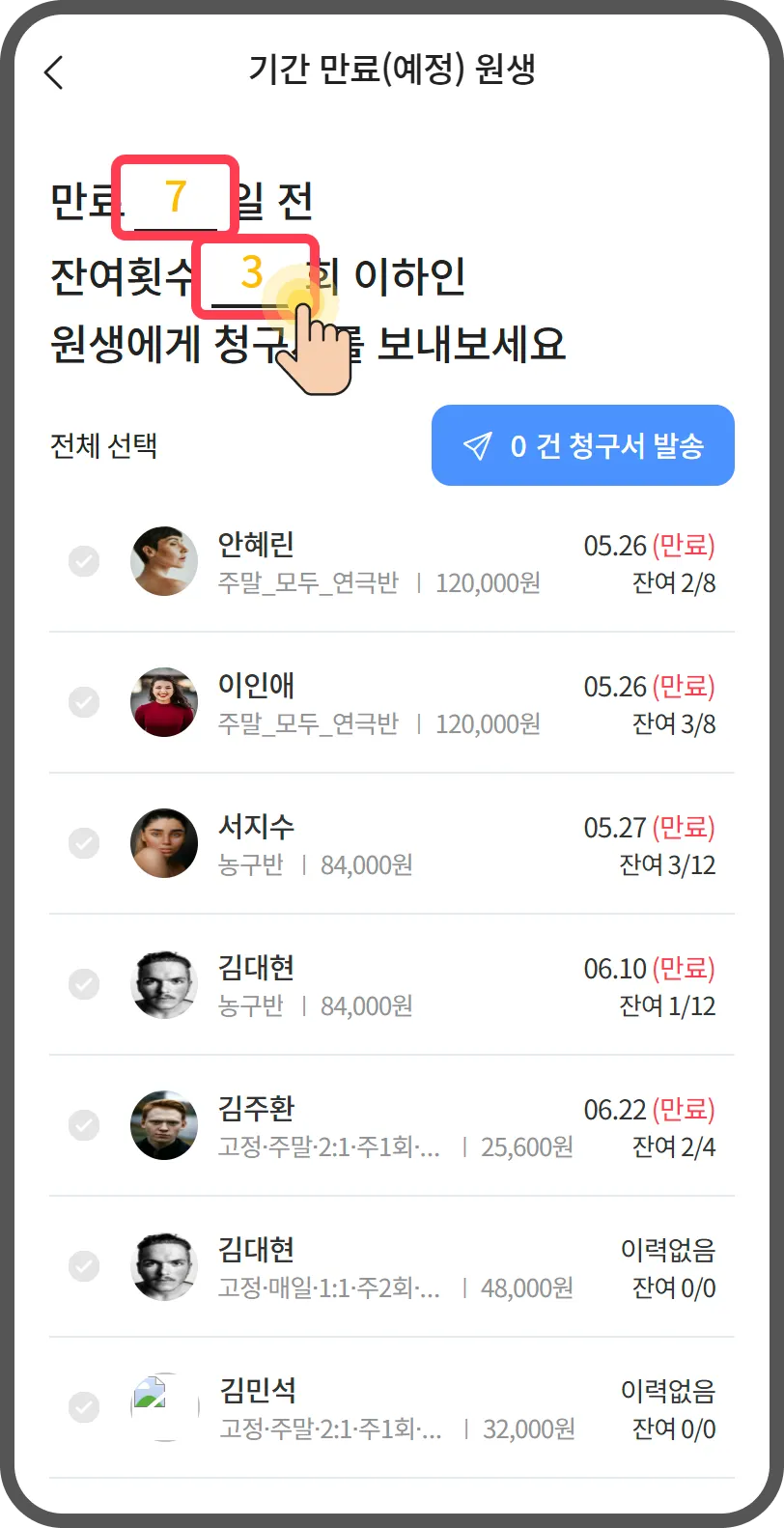 수강권이 만료되었거나 곧 만료되는 원생을 쉽게 조회 & 일괄 청구할 수 있습니다!