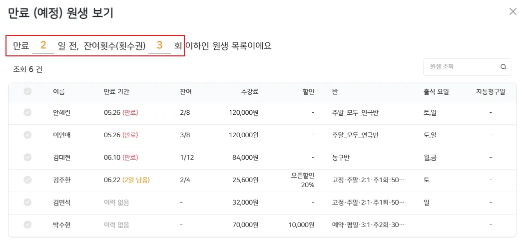 만료 (예정) 원생 보기 팝업창에서 원생 리스트를 확인해주세요.