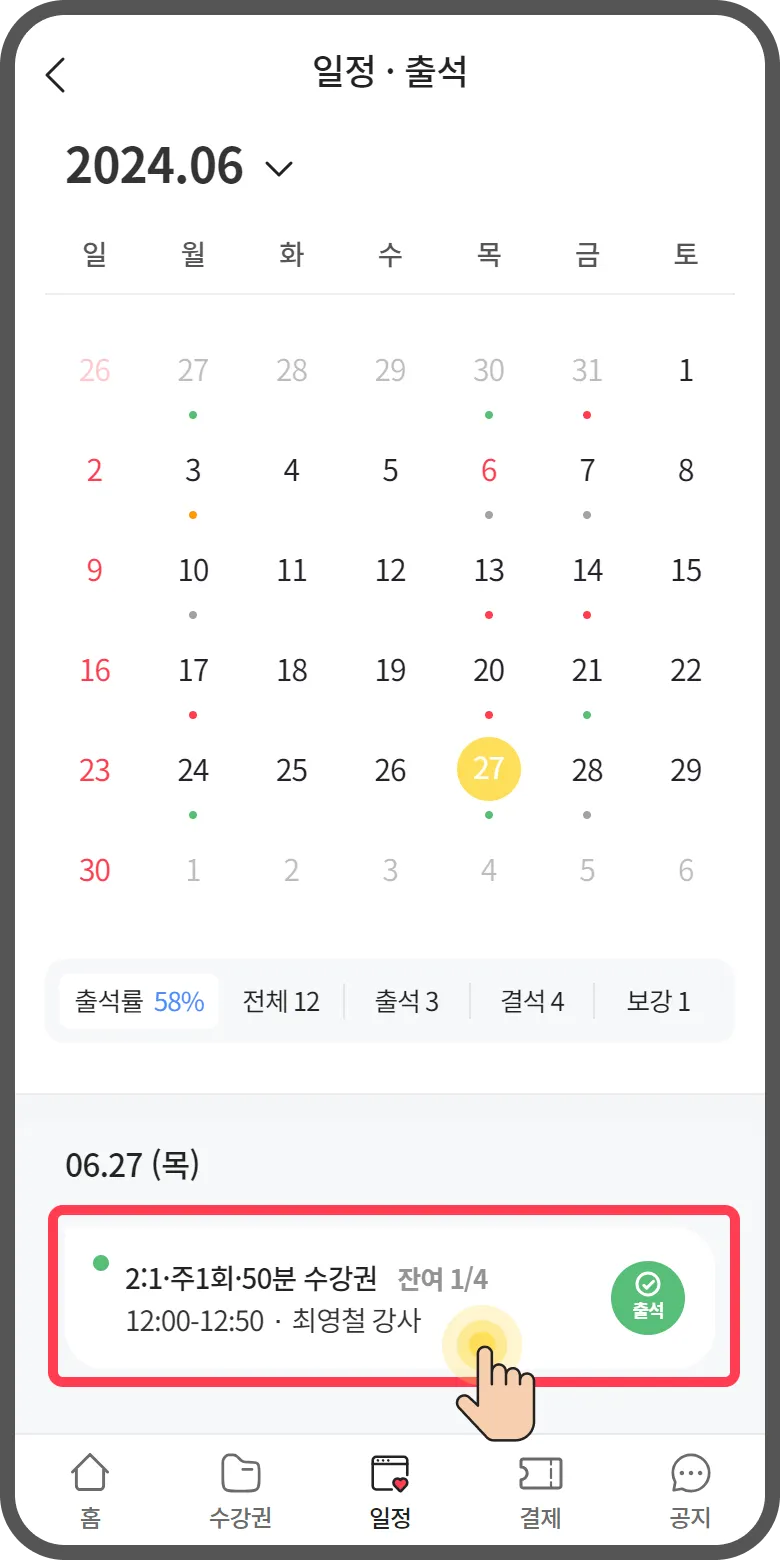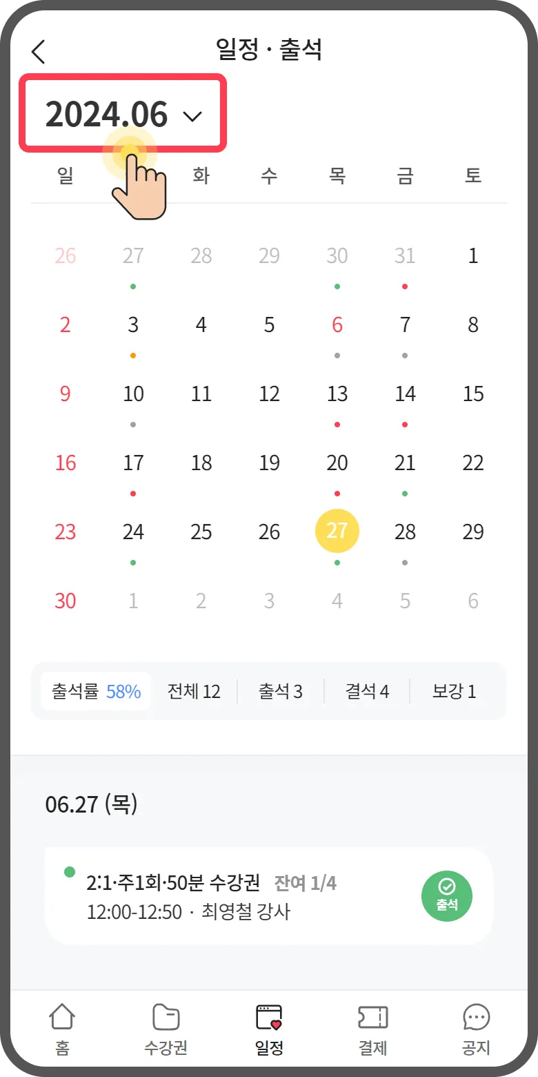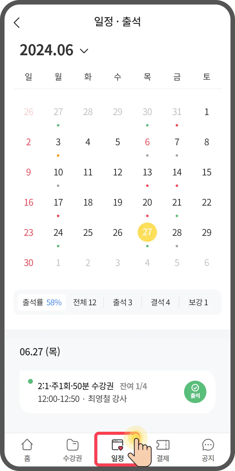 원생/학부모님, 수업 일정 및 출결 내용을 확인해 볼까요?