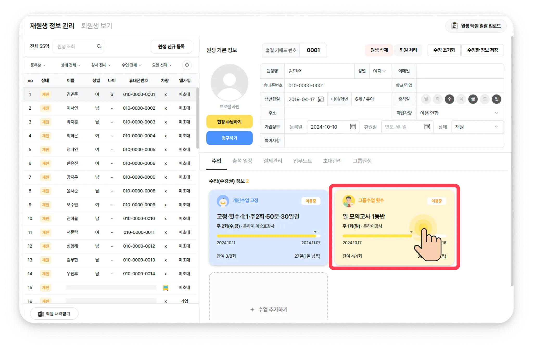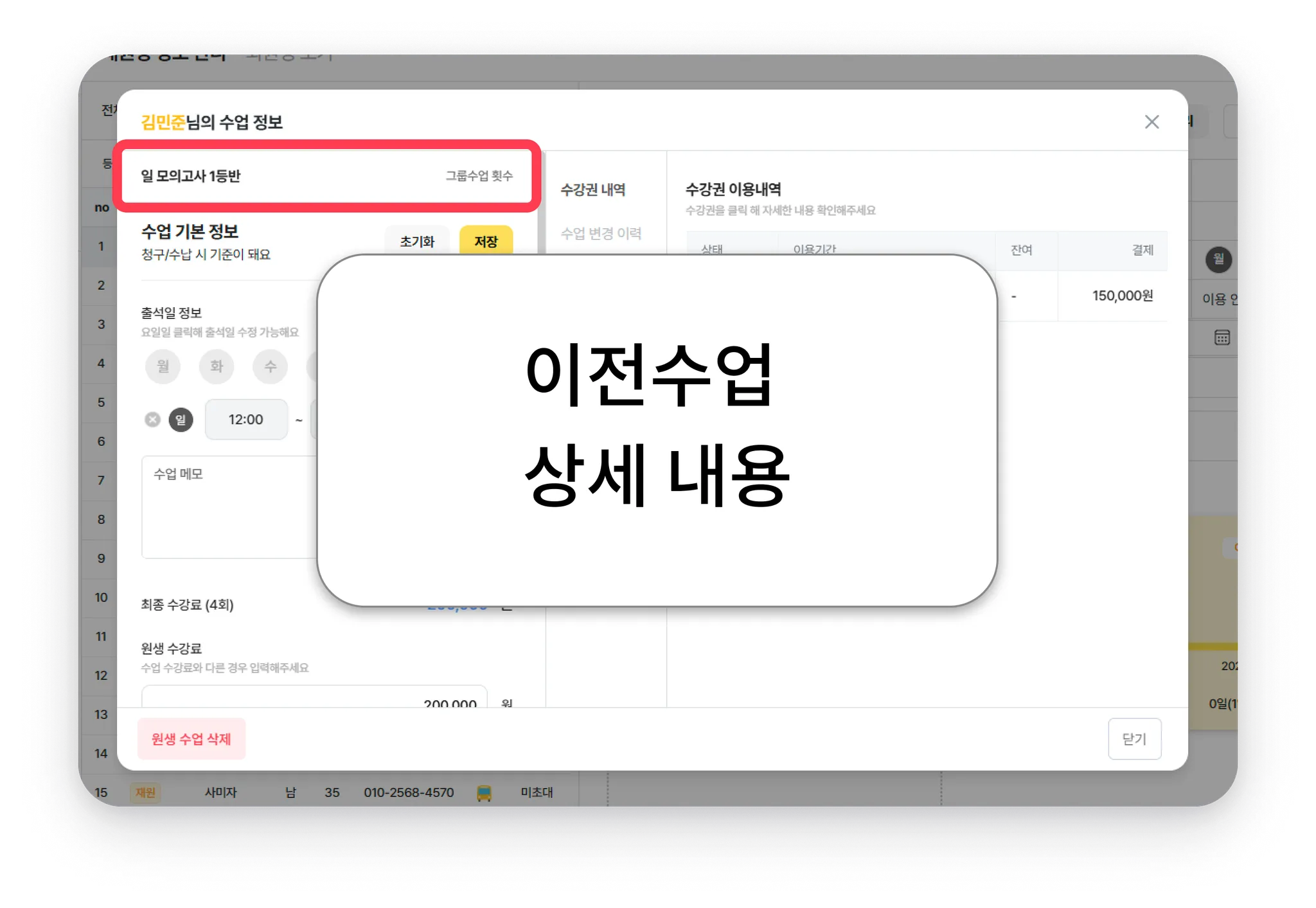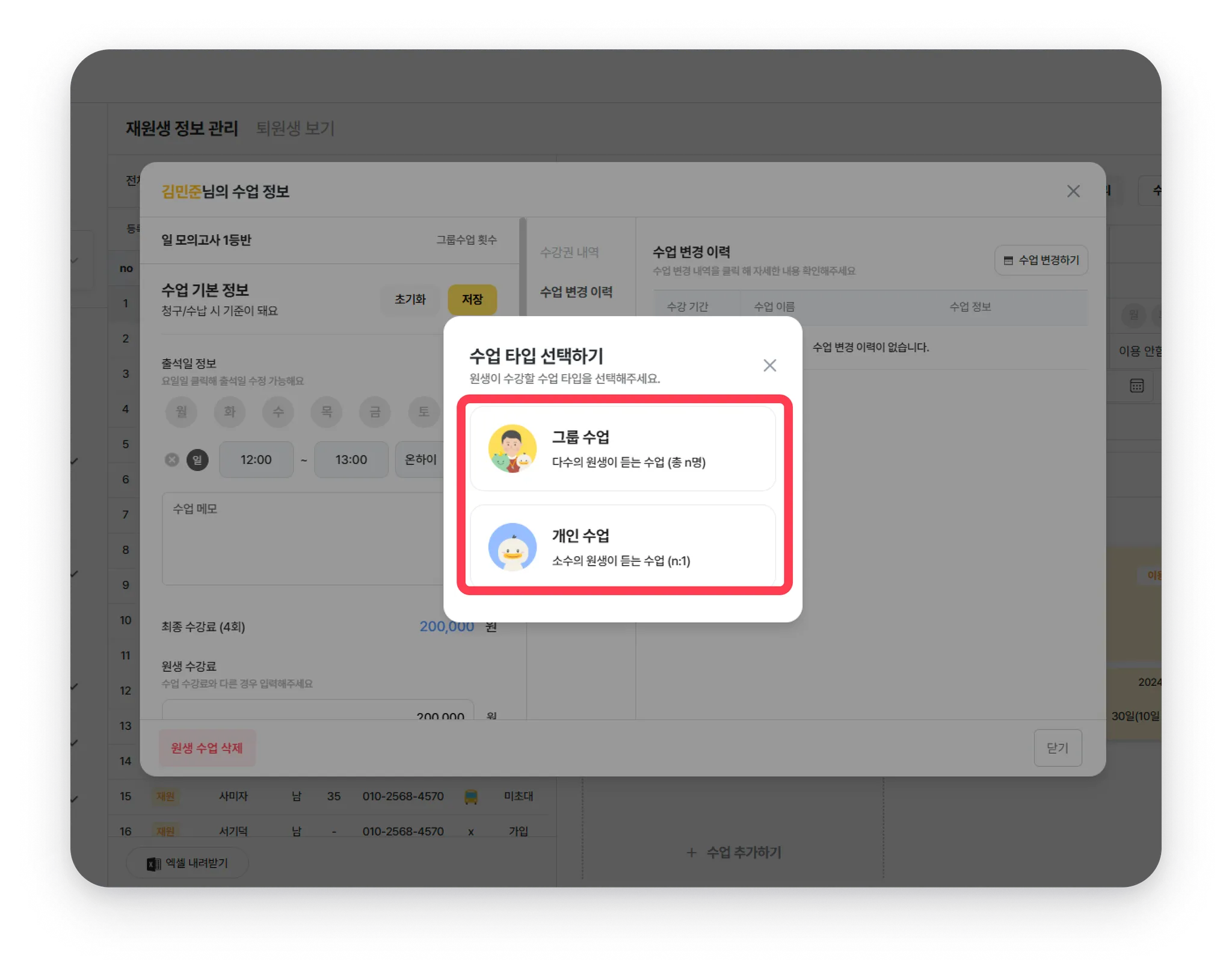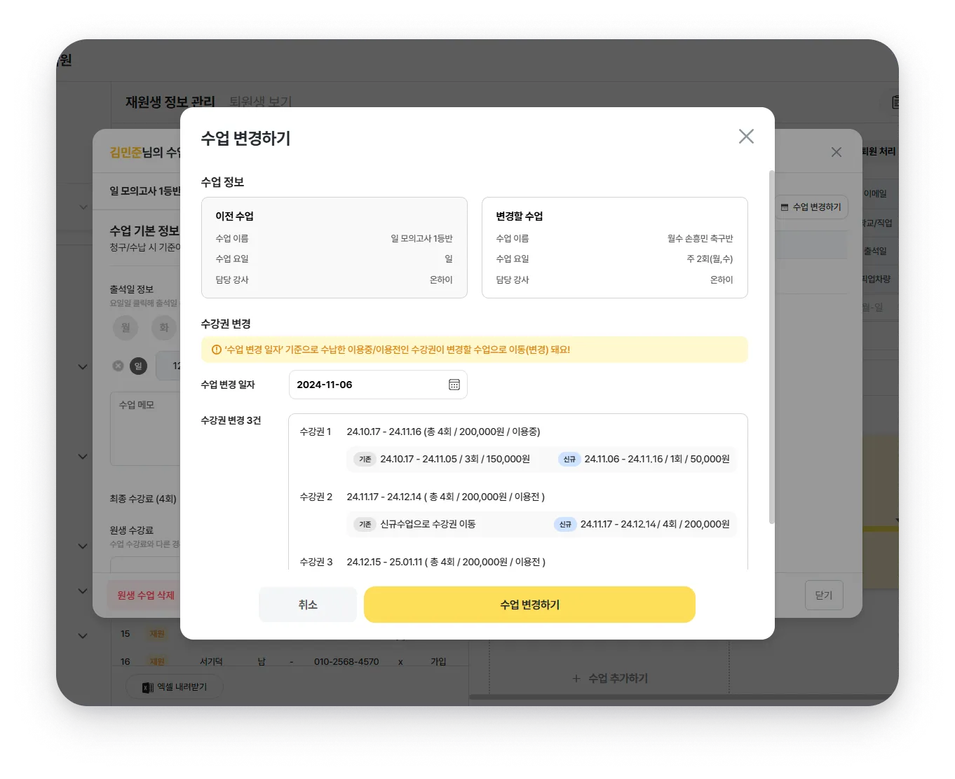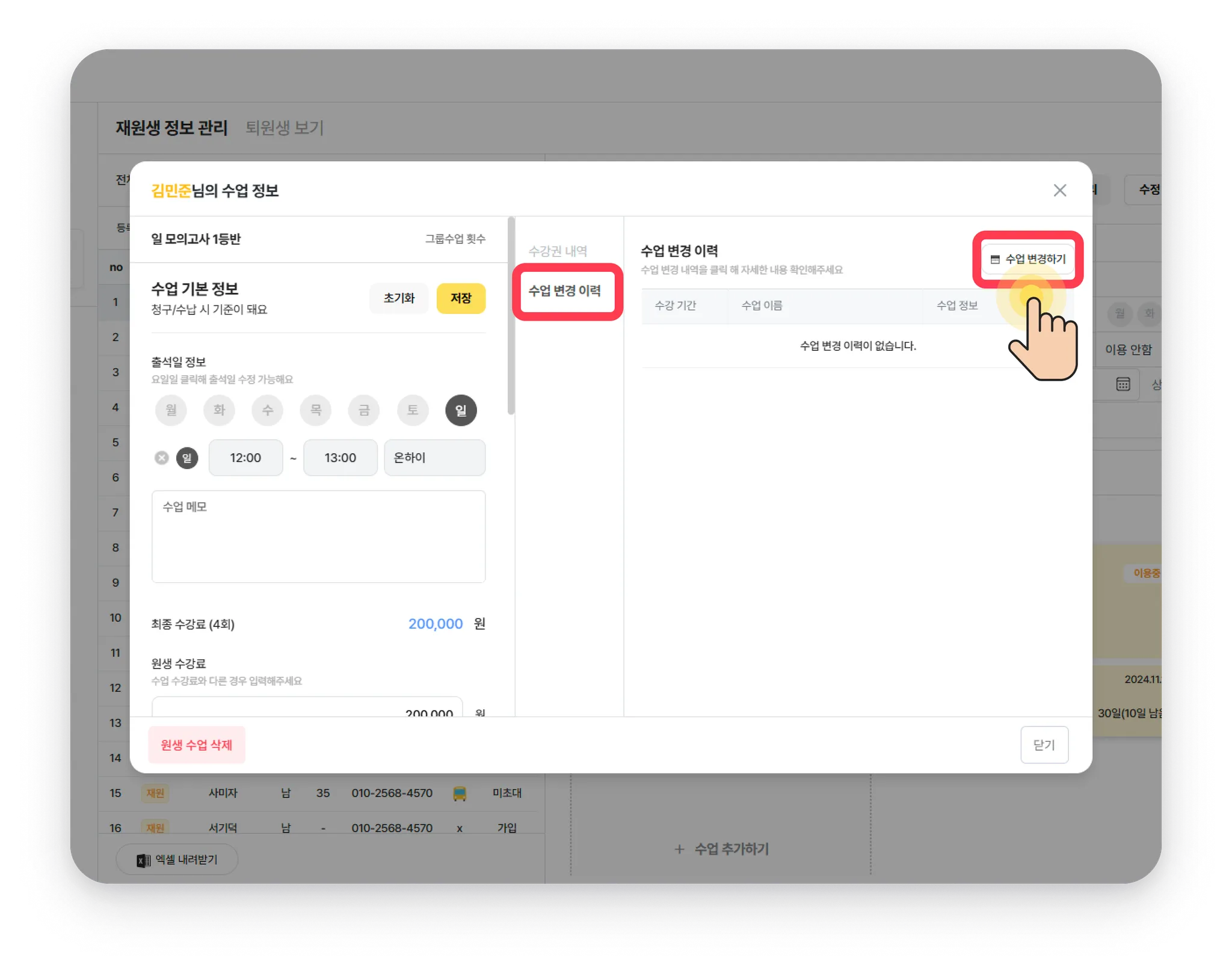 원생의 수업 상세 정보에서 오른쪽 수업 변경 이력에서 수업을 변경할 수 있어요.