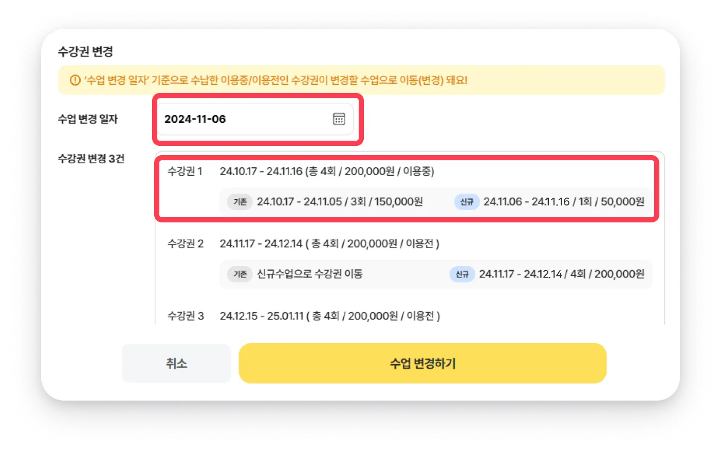 하단에서 수강권 변경 일자를 선택해 기존 수업의 수강권을 새로운 수업으로 가져올 수 있어요.