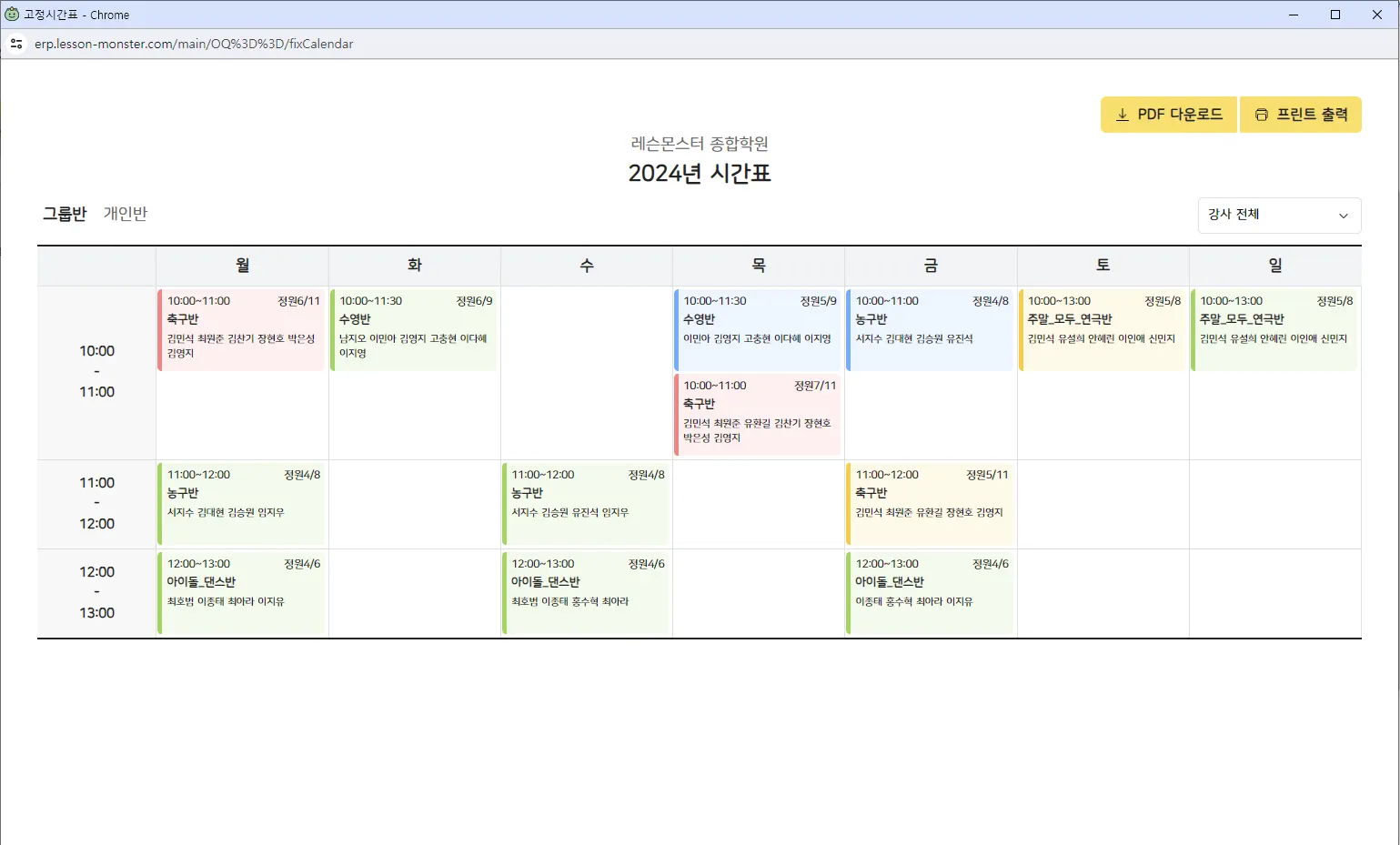 강사에겐 원생 관리 및 반 관리가 보여집니다.