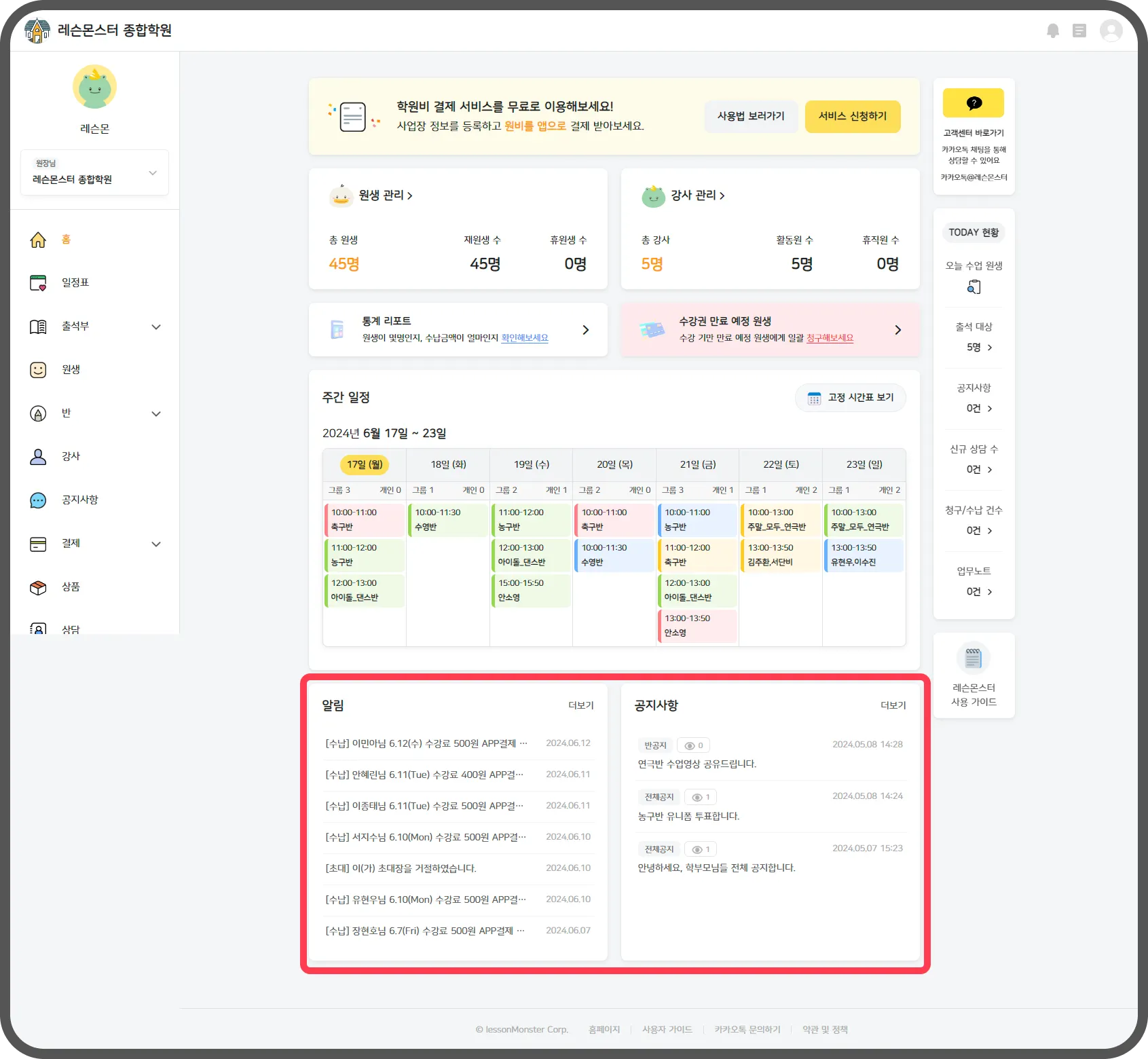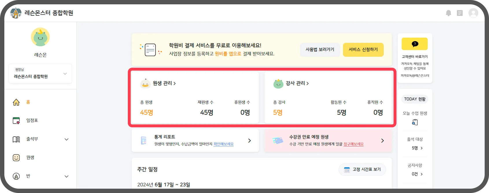 오늘의 학원 현황을 한눈에 숫자로 볼 수 있으며 바로 갈 수 있습니다.