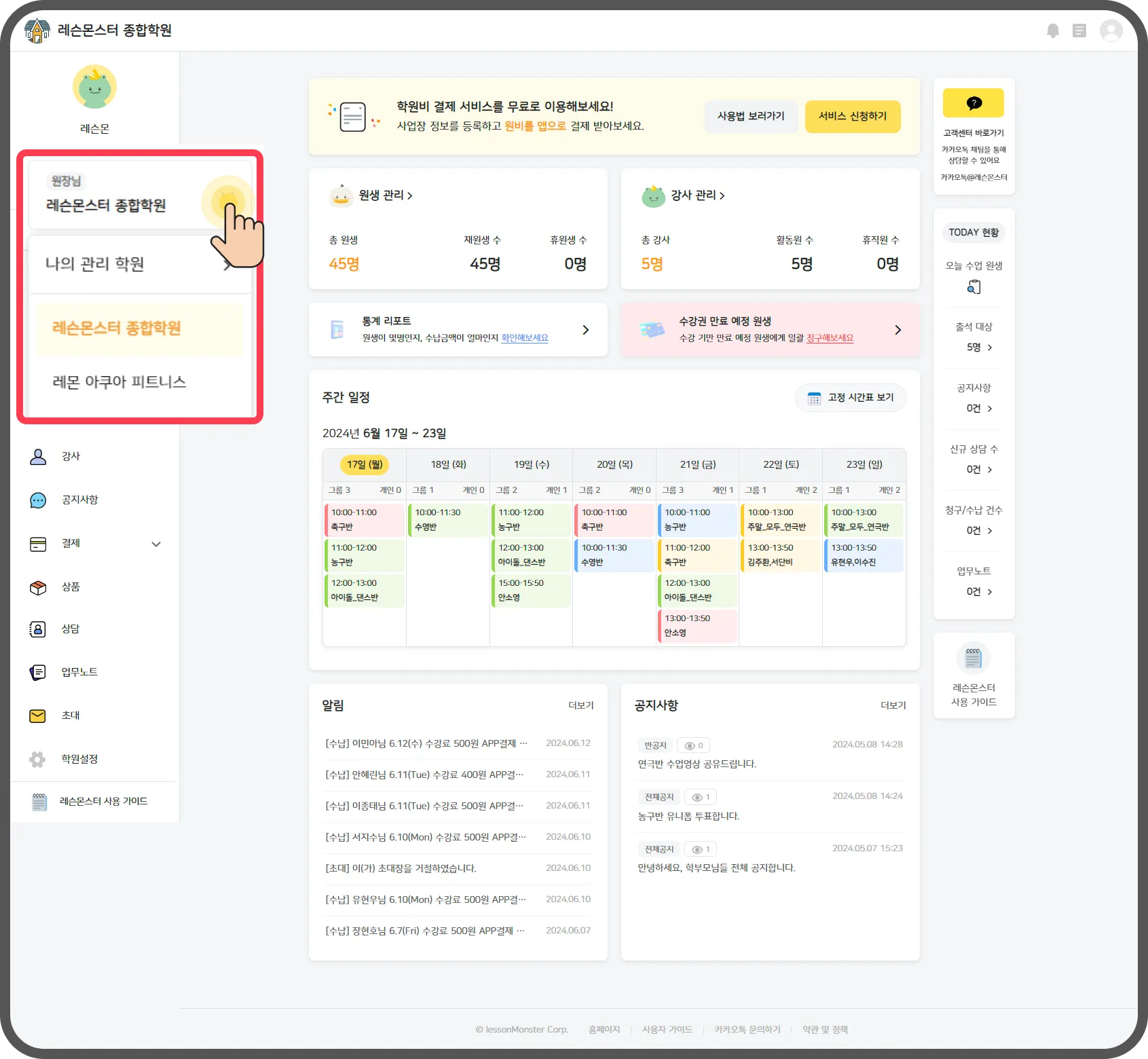 여러개의 학원과 연결돼있을 경우 사이드바에서 학원 목록을 통해 다른 학원에 입장 가능합니다.