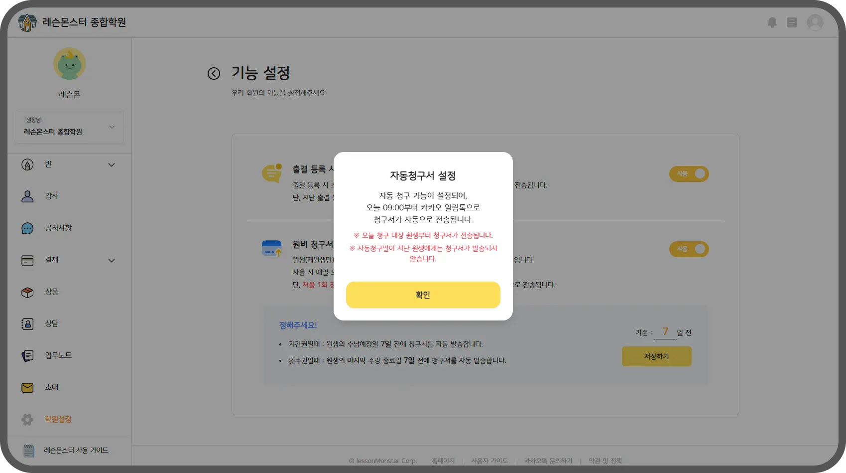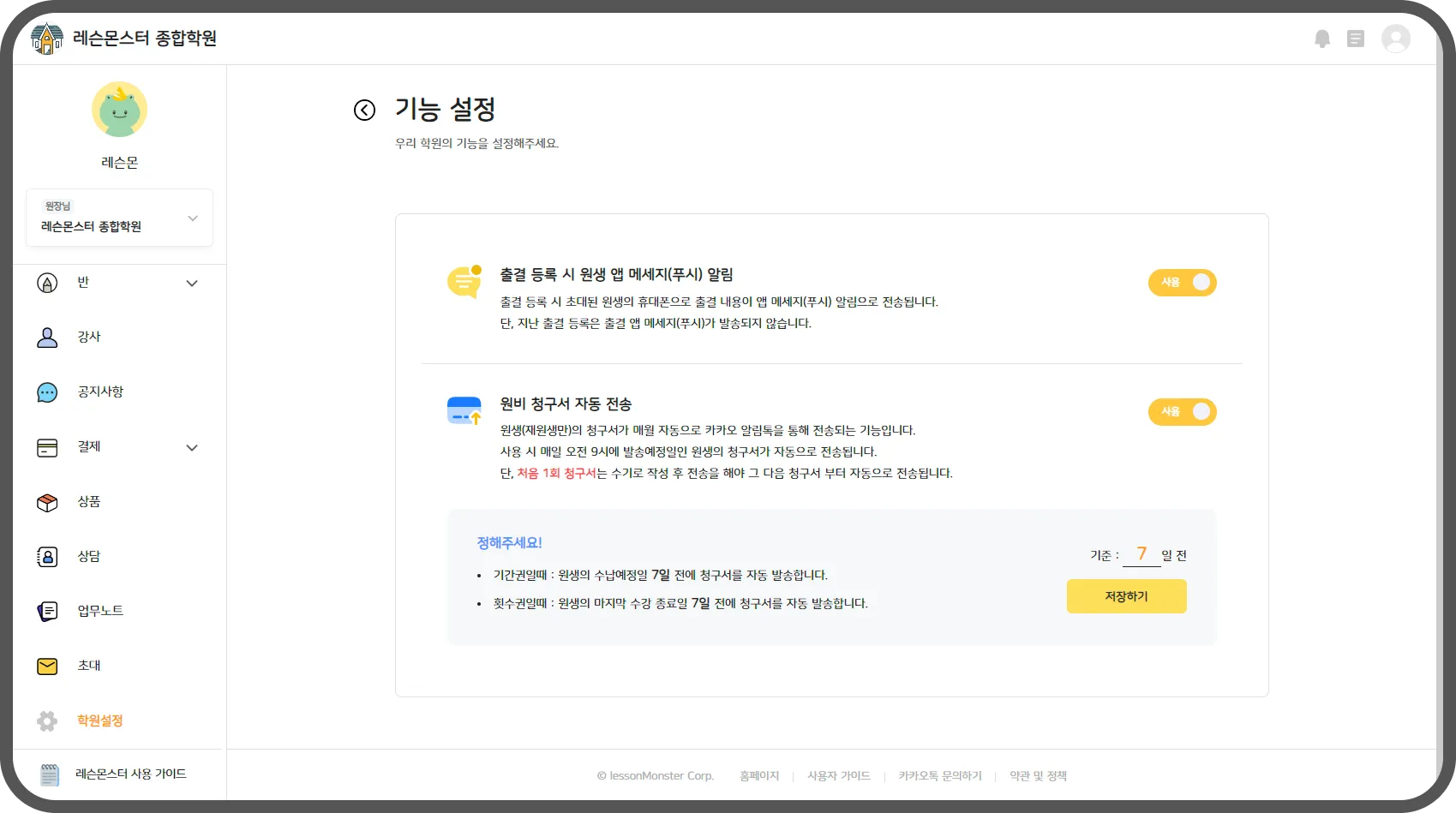 각각의 기능을 필요에 맞게 설정하여, 더욱 효율적이고 편리한 학원 운영을 경험해 보세요.