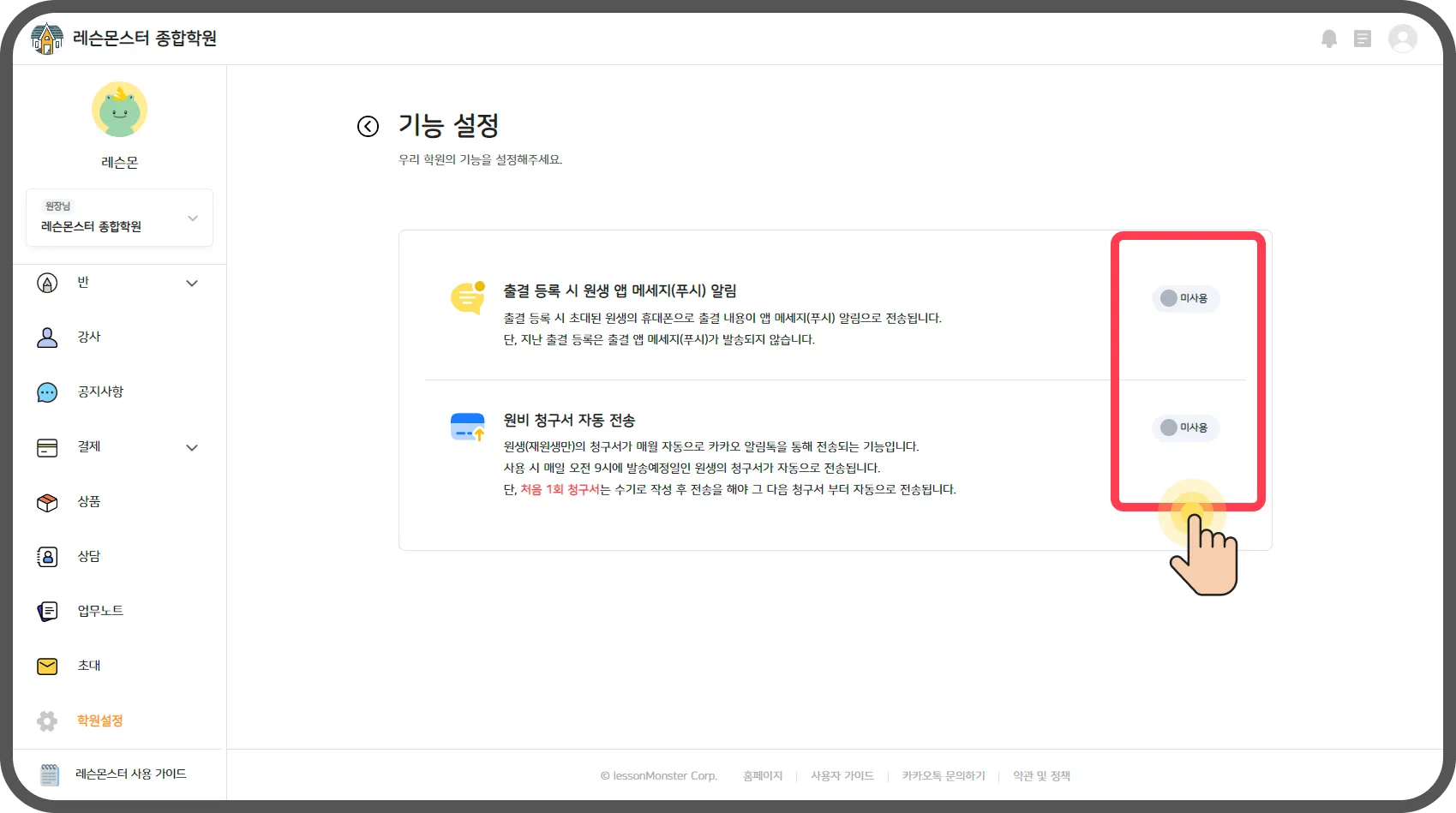 사이드바 학원설정 > 기능 설정을 클릭해 주세요.
