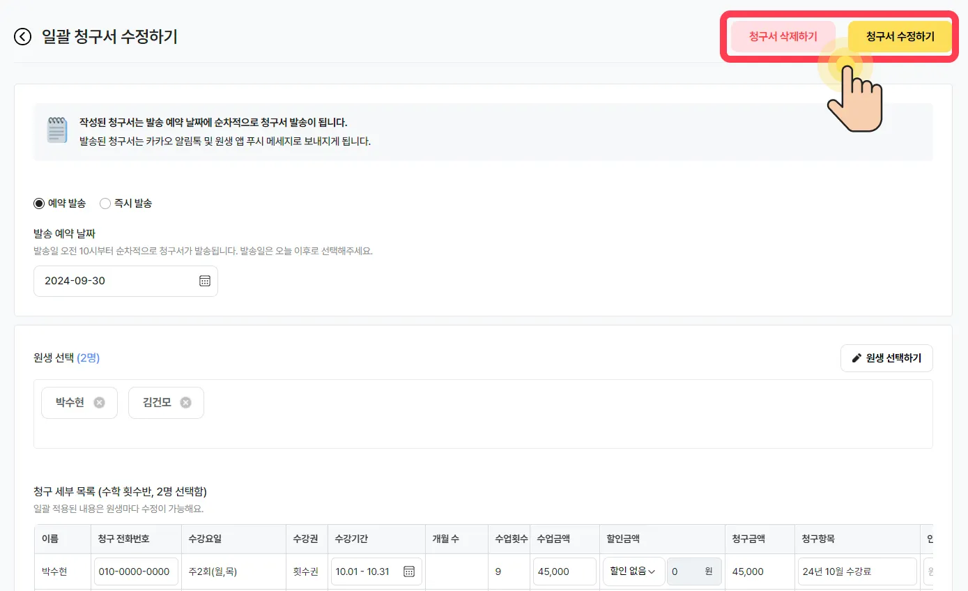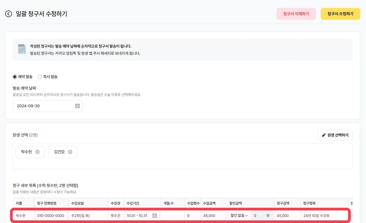 수업 운영을 횟수제로 운영중이고 원생 수강 기간이 동일하면 일괄 청구서 서비스를 이용하기 추천 드립니다!