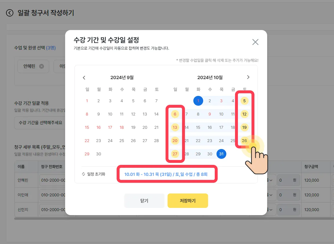 일괄로 수강 기간을 설정하고 휴강일이 있으면 수업일을 선택해 일괄적으로 휴강일로 변경해